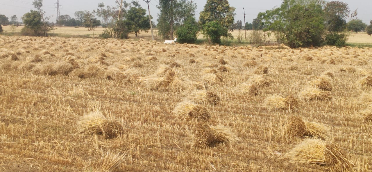 आड़ी हुई फसल: तेज हवाओं के साथ हुई बारिश के कारण खड़ी फसलें जमीन पर बिछ गई हैं, जिससे मशीन से कटाई करना असंभव हो जाएगा और उत्पादन भी घटेगा।