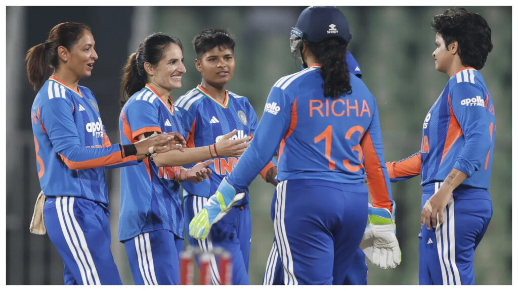 मिडिल ऑर्डर में ऋचा घोष ने 16 गेंदों पर 40 रन नाबाद बनाए, जबकि कप्तान हरमनप्रीत कौर 10 गेंदों पर 16 रन नाबाद रहकर पारी के अंत तक क्रीज पर मौजूद रहीं।