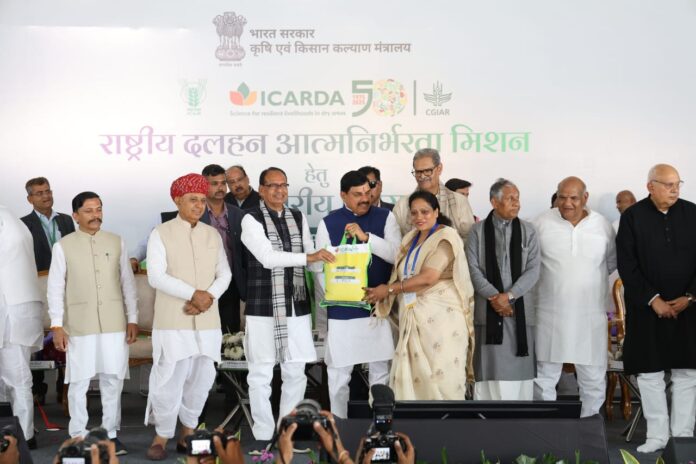 सीहोर (अमलाहा): मध्य प्रदेश को दलहन उत्पादन में अग्रणी बनाने और विदेशी दालों पर निर्भरता खत्म करने के संकल्प के साथ शनिवार को अमलाहा स्थित इर्काडा (ICARDA) कैंपस में राष्ट्रीय दलहन सम्मेलन का आयोजन किया गया। इस कार्यक्रम में मुख्यमंत्री डॉ. मोहन यादव और केंद्रीय कृषि मंत्री शिवराज सिंह चौहान ने शिरकत की।
