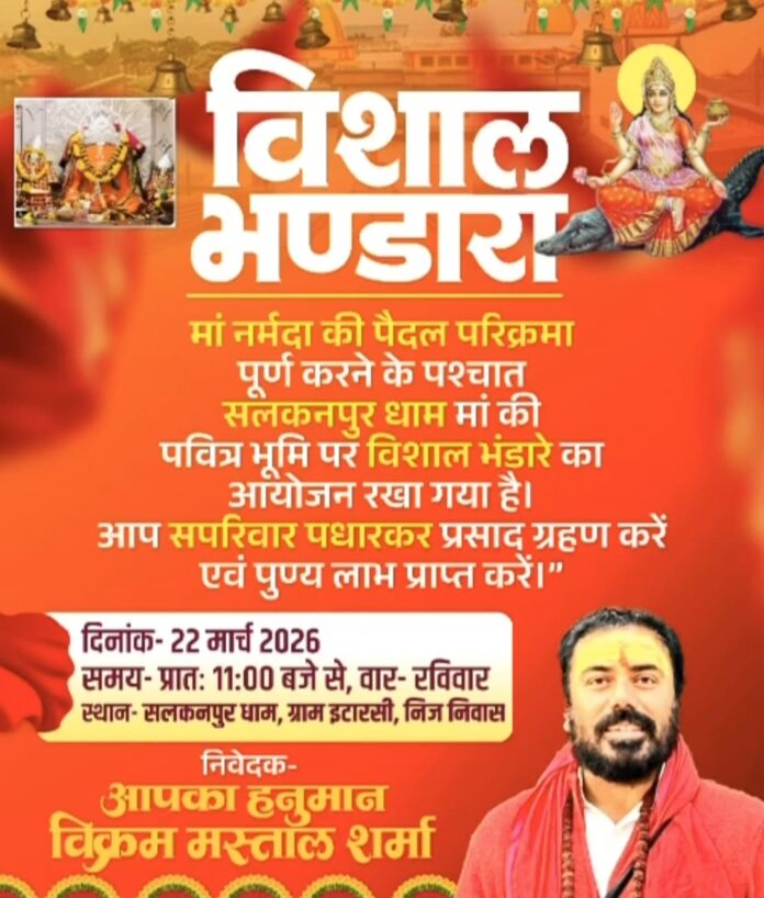 रेहटी/सलकनपुर | 20 मार्च 2026 नर्मदा भक्त और कांग्रेस नेता विक्रम मस्ताल शर्मा ‘हनुमानजी’ ने भक्ति और संकल्प की एक नई मिसाल पेश की है। मात्र 90 दिनों में नर्मदा मैया की पैदल परिक्रमा पूरी करने के बाद, अब आगामी 22 मार्च को उनके निज निवास (सलकनपुर-इटारसी) पर विशाल भंडारे का आयोजन होने जा रहा है।