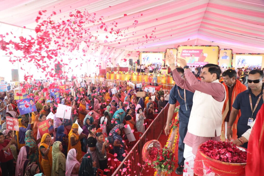 उत्साह का माहौल: मुख्यमंत्री डॉ. यादव मंच से जनता और लाड़ली बहनों पर पुष्प वर्षा कर उनका आशीर्वाद प्राप्त करते हुए।
