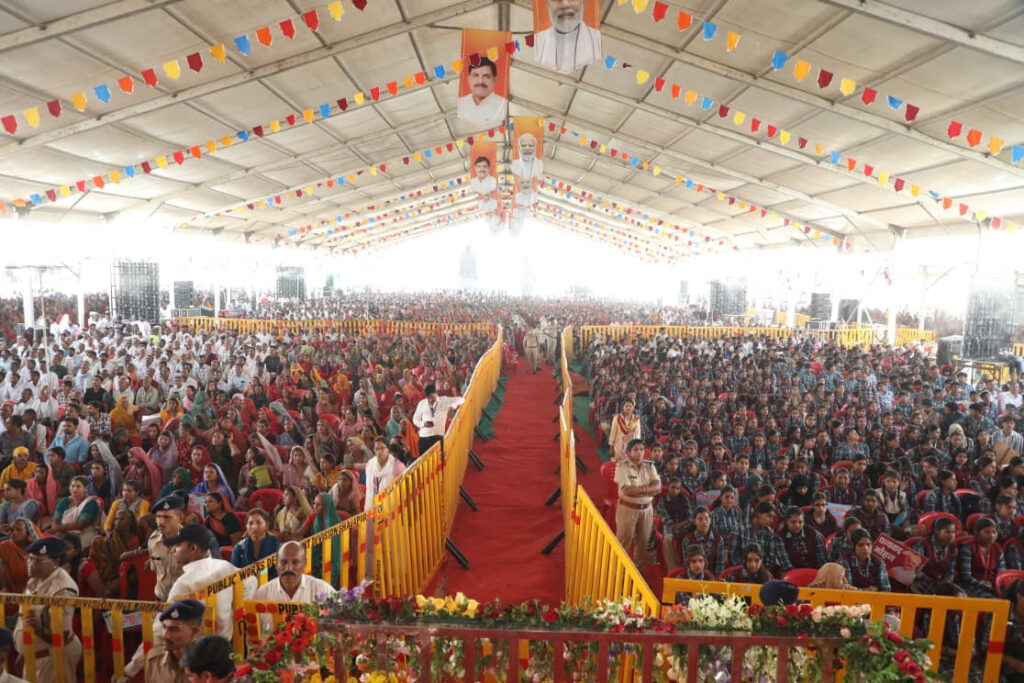मुख्यमंत्री डॉ. यादव मंच से दोनों हाथ उठाकर लाड़ली बहनों और जनता का अभिवादन स्वीकार करते हुए और प्रदेश के विकास का संकल्प दोहराते हुए।