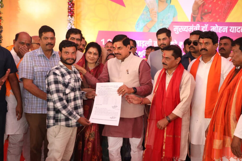 अधिकार की शक्ति: मुख्यमंत्री डॉ. यादव विभिन्न सरकारी योजनाओं के पात्र हितग्राहियों को प्रमाण पत्र वितरित कर उन्हें लाभान्वित करते हुए।