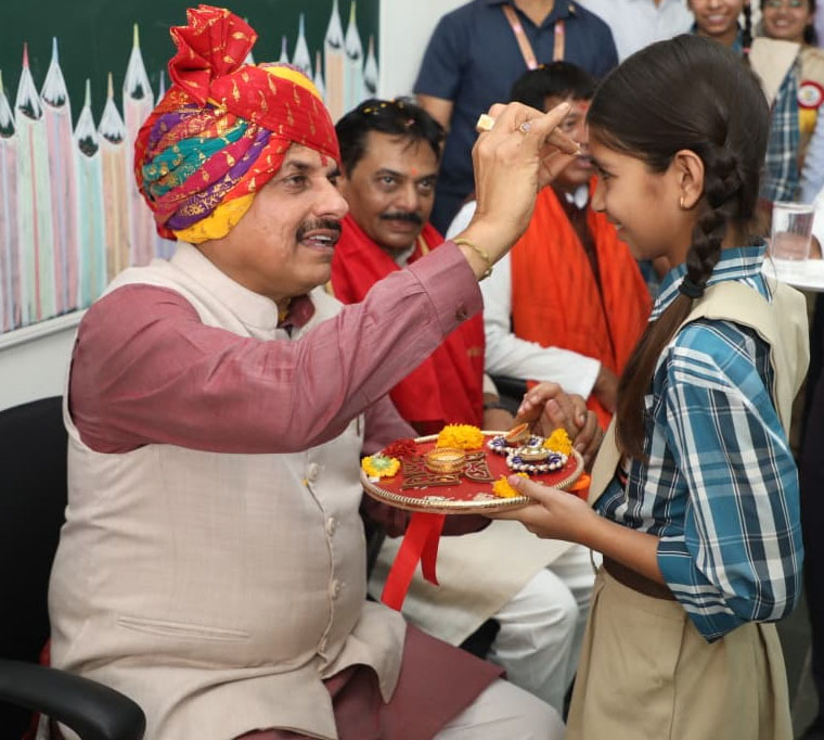 मुख्यमंत्री डॉ. यादव आष्टा के नवनिर्मित सांदीपनि विद्यालय में छात्रा को तिलक लगाते हुए। उन्होंने यहाँ प्राइवेट स्कूलों से सरकारी स्कूल में आए बच्चों से संवाद किया और गुणवत्तापूर्ण शिक्षा का वादा दोहराया