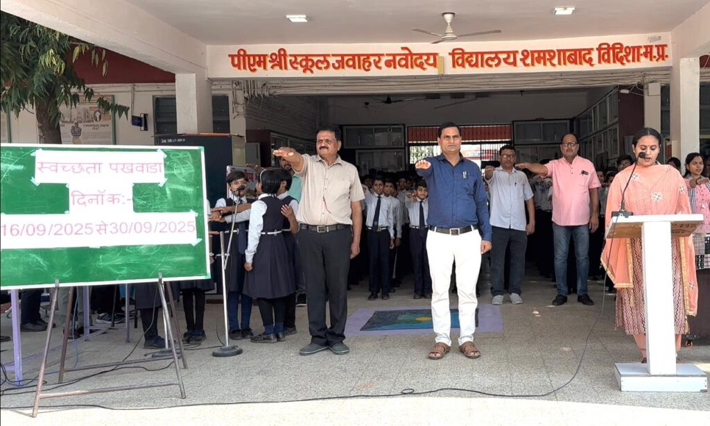 पीएम श्री स्कूल जवाहर नवोदय विद्यालय, शमशाबाद में मंगलवार से स्वच्छता पखवाड़ा धूमधाम से प्रारंभ हुआ। कार्यक्रम का शुभारंभ कक्षा 12वीं के छात्र कल्याण ने सभी विद्यार्थियों और कर्मचारियों को स्वच्छता की शपथ दिलाकर किया।