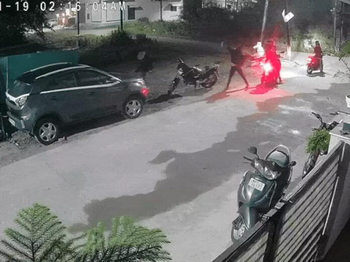 भोपाल / के गांधीनगर इलाके में मंगलवार देर रात बड़ी वारदात सामने आई, जहाँ राजा भोज परिसर में छह अज्ञात बदमाशों ने घुसकर जमकर उत्पात मचाया। घटना लगभग रात 2 बजे की है, जब बदमाश बुलेट पर सवार होकर कॉलोनी में दाखिल हुए और वहां खड़ी कारों को निशाना बनाकर तोड़फोड़ शुरू कर दी। पूरी घटना CCTV कैमरों में स्पष्ट रूप से रिकॉर्ड हो गई है।