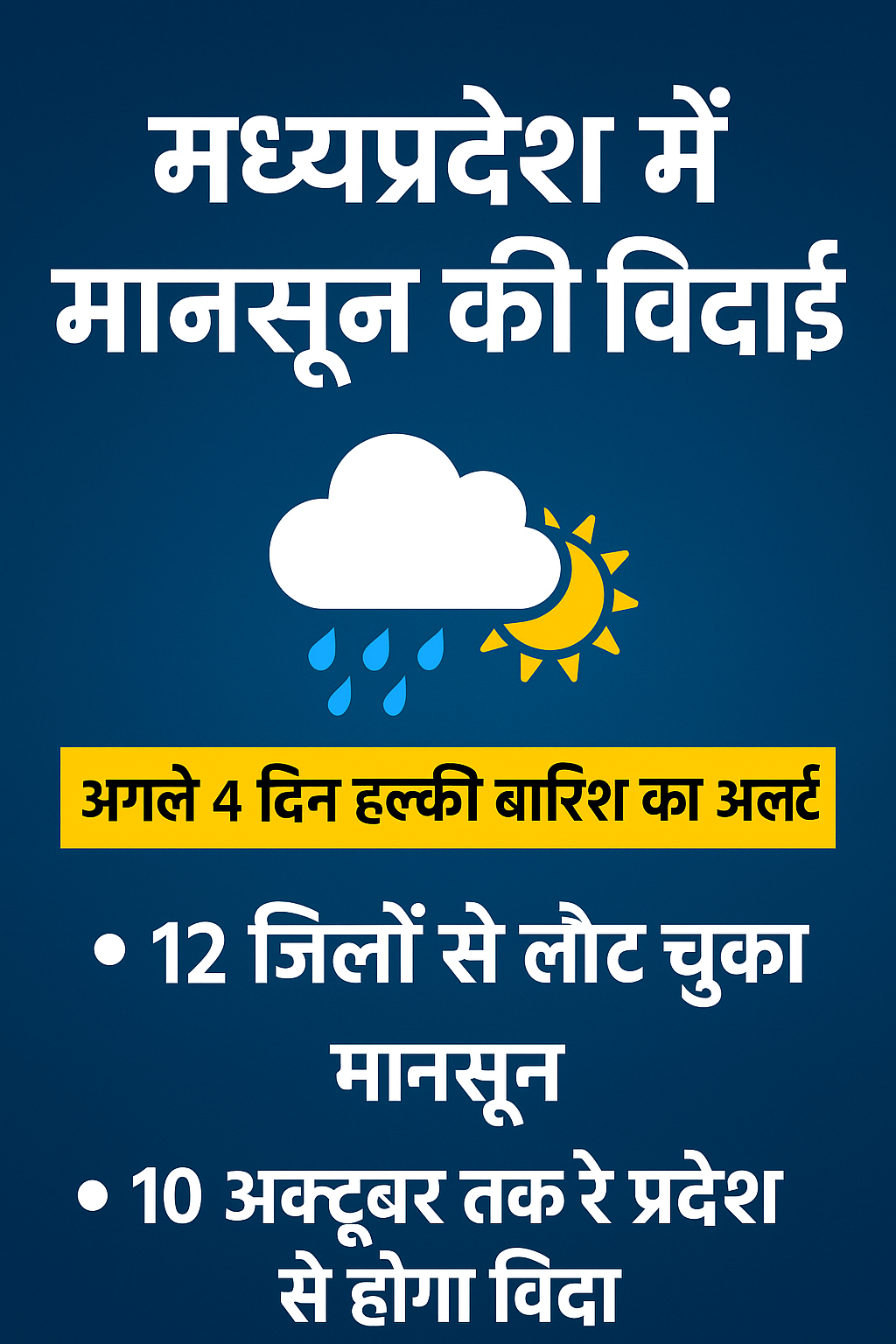 भोपाल/इंदौर/ मध्यप्रदेश में मानसून की विदाई का दौर जारी है। मौसम विभाग के मुताबिक, अगले 4 दिन हल्की बारिश होने की संभावना है। दशहरे के दिन भी बारिश का अलर्ट जारी किया गया है। हालांकि बुधवार सुबह भोपाल में तेज धूप खिली रही।