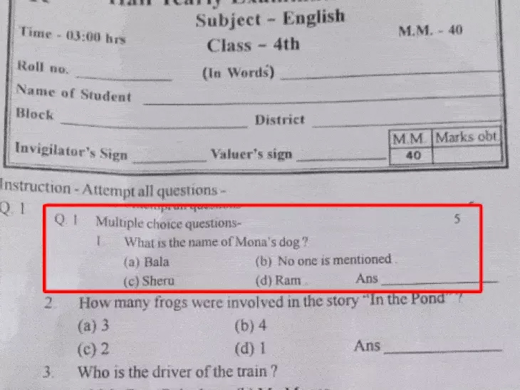 बुधवार को कक्षा चौथी की अंग्रेजी परीक्षा के दौरान एक बहुविकल्पीय प्रश्न पूछा गया: