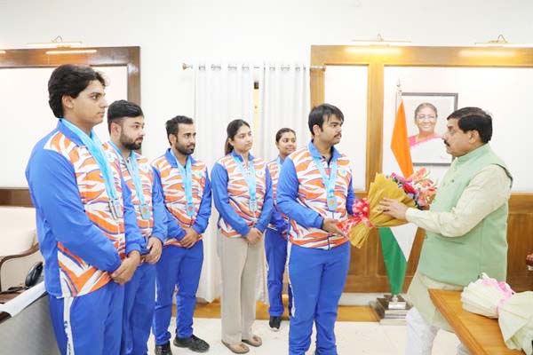 भोपाल, 1 अक्टूबर 2025। मुख्यमंत्री डॉ. मोहन यादव ने बुधवार को मुख्यमंत्री निवास पर 16वीं एशियन शूटिंग चैम्पियनशिप में पदक जीतने वाले 9 खिलाड़ियों से सौजन्य भेंट की। इस अवसर पर मुख्यमंत्री ने सभी विजेताओं को उनके शानदार प्रदर्शन के लिए बधाई दी और खेल एवं युवा कल्याण विभाग की ओर से 10.81 लाख रुपये से अधिक की प्रोत्साहन राशि प्रदान कर सम्मानित किया।