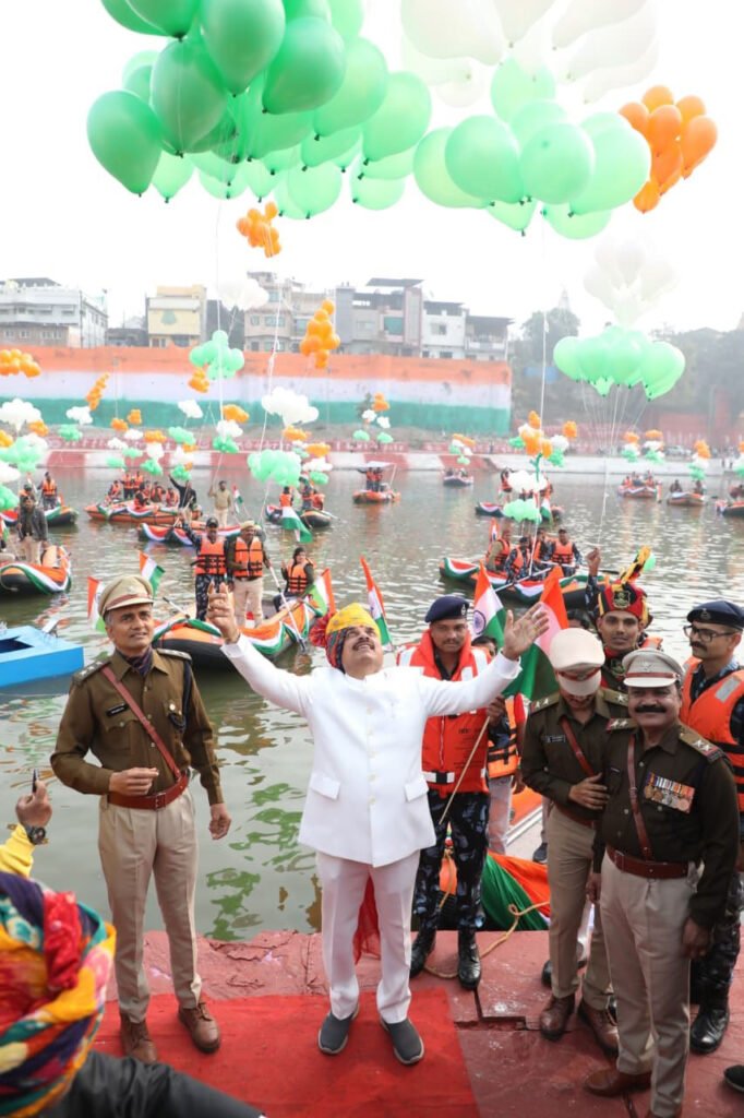 मुख्यमंत्री डॉ. यादव ने शिप्रा तट स्थित सुनहरी घाट पर तिरंगे रंग के गुब्बारे खुले आकाश में छोड़कर राष्ट्रभक्ति और जनसेवा का संदेश दिया।