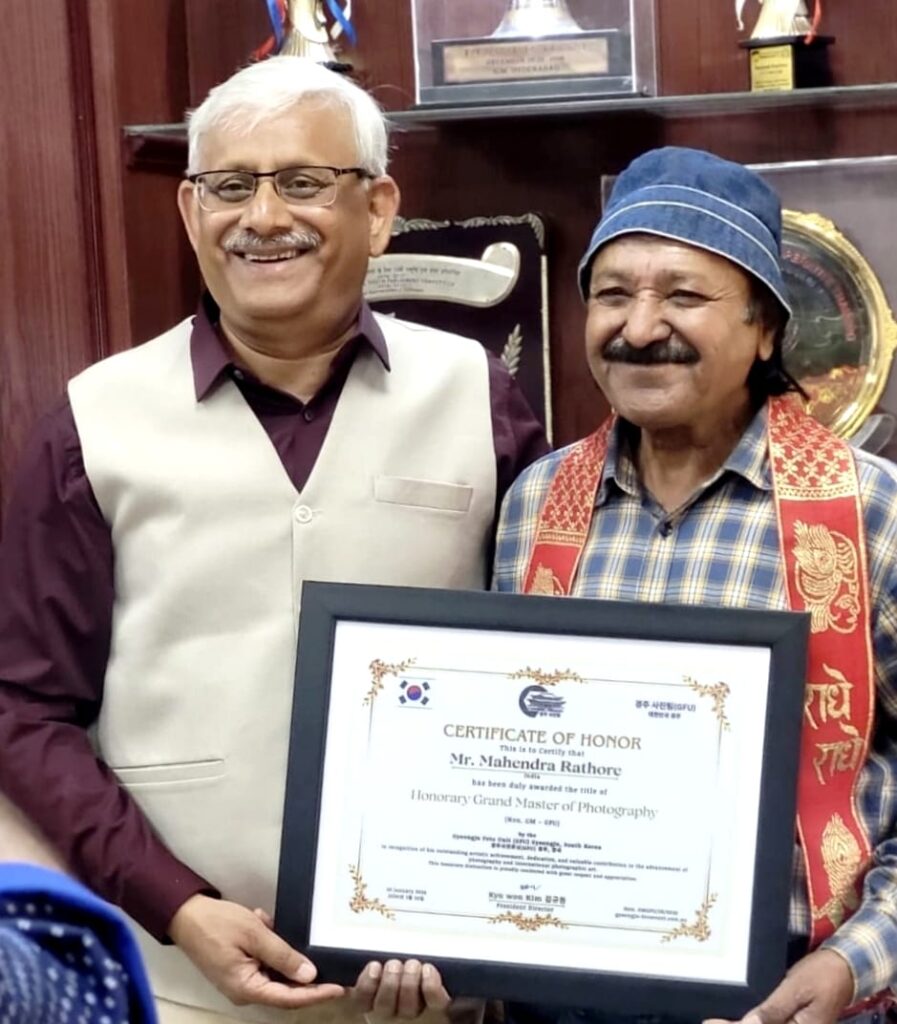 इंदौर। देवी अहिल्या विश्वविद्यालय (DAVV) के पूर्व वरिष्ठ कर्मचारी और देश-प्रदेश के प्रतिष्ठित फोटोग्राफर श्री महेंद्र राठौर ने एक बार फिर अंतरराष्ट्रीय स्तर पर इंदौर और मध्यप्रदेश का नाम रोशन किया है। फोटोग्राफी के क्षेत्र में उनके विशिष्ट योगदान के लिए उन्हें दक्षिण कोरिया (South Korea) द्वारा प्रतिष्ठित अंतरराष्ट्रीय पुरस्कार से सम्मानित किया गया है।