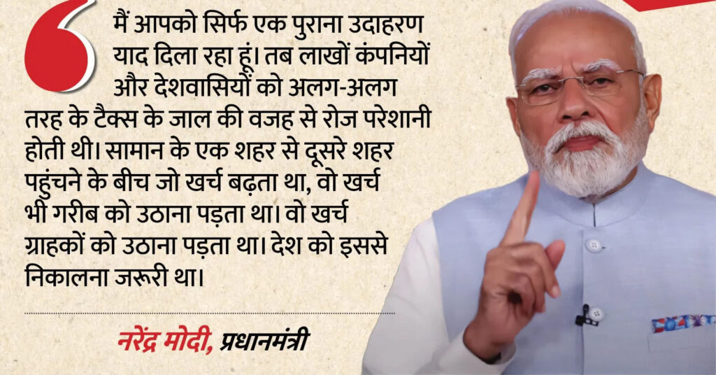 मोदी ने याद दिलाया कि 2017 में जीएसटी लागू होने से पहले देश में दर्जनों टैक्स (एंट्री टैक्स, सेल्स टैक्स, एक्साइज, वैट, सर्विस टैक्स आदि) लागू थे।