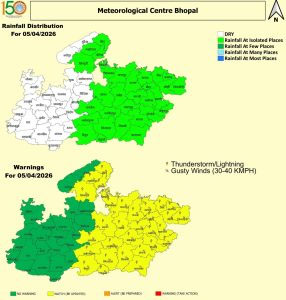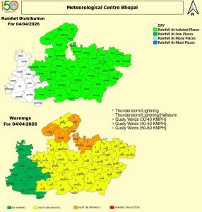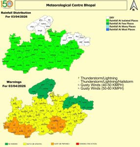 4 अप्रैल (शनिवार)वज्रपात, ओलावृष्टि, 50km/h हवाभोपाल, सीहोर, ग्वालियर, इंदौर, उज्जैन, जबलपुर